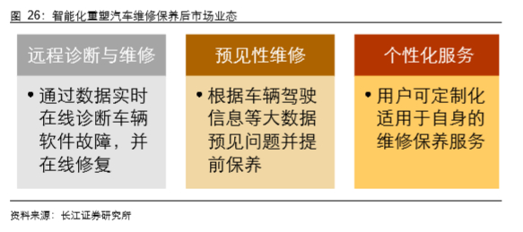 二是汽车软件的普及下,未来会出现更多软件层面的故障,并且基于车联网的数据在线共享,远程诊断、维修等方式也成为了可能。未来整车厂或将基于大数据分析开展远程诊断与维修、预见性维修、 个性化服务推送等新兴业态。