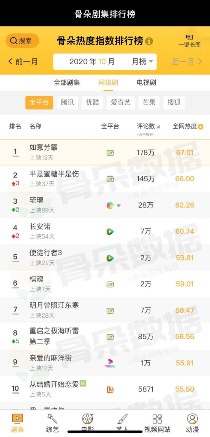 10月云合正片有效播放TOP10爱奇艺占5席 《半是蜜糖半是伤》市场占有率超10%