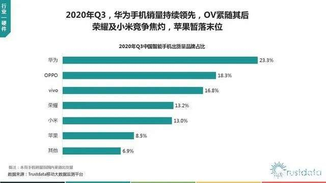 研究机构Trustdata 最新发布的《2020年Q3中国移动互联网行业发展分析报告》显示,第三季度,华为手机销量国内占比达到 23.3%,位居第一,紧随其后的是 OPPO,占比达18.3%,vivo、荣耀、小米则分别以 16.8%、13.2%、13.0% 的市场份额位居第三、四、五名。苹果的市场份额只有8.5%,中国市场销量占比跌出前五。