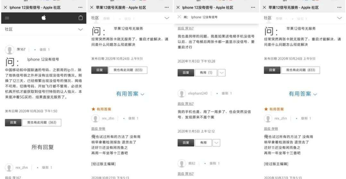 实际上,遭遇iPhone12没有信号困扰的远远不止他一人。在苹果官方Apple社区,一位用户于10月26日发帖表示,刚换iPhone12三日,就已经频繁出现没信号的情况,切换号码、飞行模式等方式都不管用,必须关机重启才能获取信号。