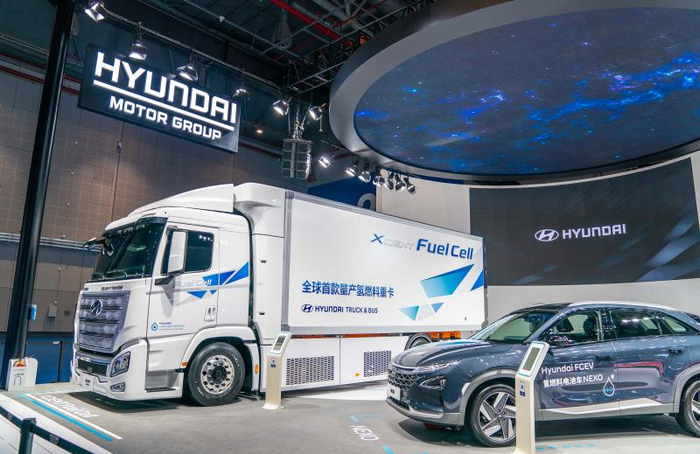 韩国现代汽车则展出了全球首款量产氢燃料重卡XCIENT Fuel Cell。这辆车身总重量34吨的大车,搭载了由2个氢燃料电池组组成的电池系统,全车内装7个大型储氢罐,加氢时间需8-20分钟,加氢一次的续航里程可达到400公里左右。据说,现代汽车于今年7月已向瑞士启程出口这辆车,并计划在2021年打造最多2000辆氢燃料电池卡车,拓展欧洲、北美、中国等市场。
