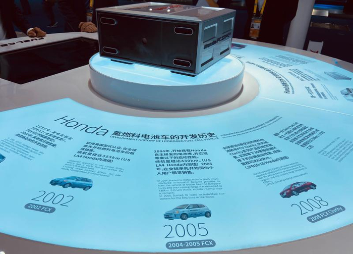 现场的日本技术人员说,以搭载第三代燃料电池的最新一代 Clarity Fuel Cell车型为例,最大可实现 130千瓦的输出功率和 300N·m的峰值扭矩,使强劲动力与高效环保达到统一;与此同时,每次加满氢只需3分钟,最大续航里程高达 750公里,为同类产品最高水准。