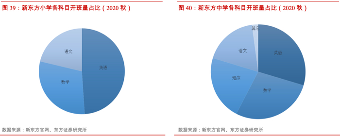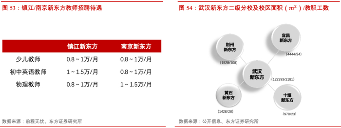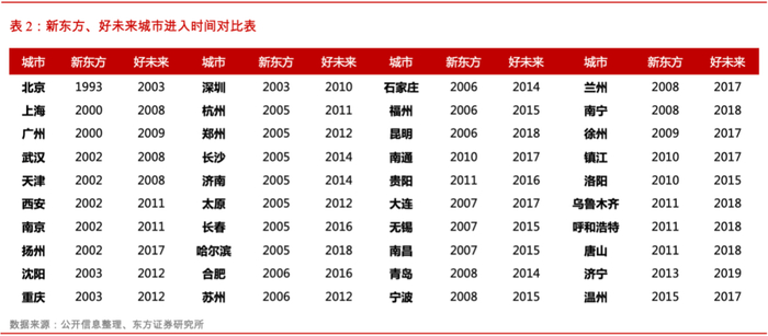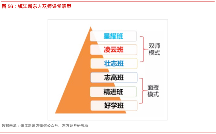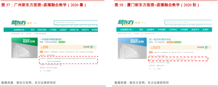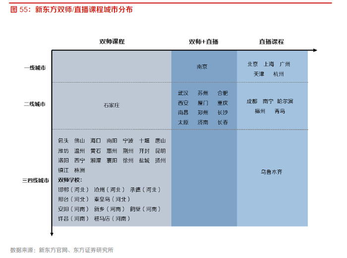 双师模式由双师东方和新东方已有分校共同试点,当前以分校试点为主。在2020财年第二季度电话会议中,公司提到“双师的重点以后放在河南与河北”。截至2020财年,双师东方共进入20座城市,除10座在河北与河南的三四线城市保留双师学校外,其余城市均已转为面授模式。此外,新东方在48/29个现有城市中提供小学/中学双师课程,大多分布在三四线城市。