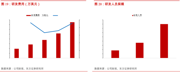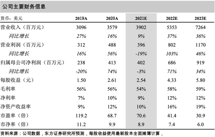 在管理费用端,公司保持稳定研发投入和管理人员的配置,研发人员规模效应逐步显现,我 们预计管理费用率稳定下降,21-23E 管理费用率 32.9%/32.1%/31.5%。