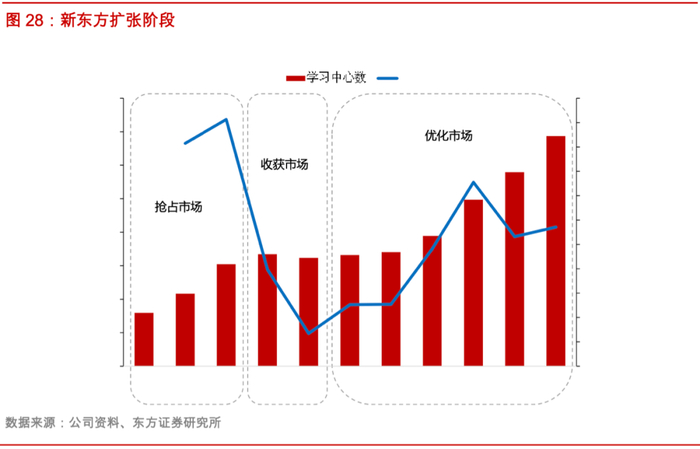 2015年至今:优化市场战略。新东方开启新一轮扩张,关注规模与盈利的共同增长。在这一阶段,网点扩张保持较快速度,其中2018财年第四季度同比增长率达26.4%。