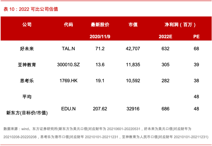 公司作为国内课外培训第一品牌,长期品牌护城河深厚,短期受到公共卫生事件影响,收入业绩有所承压,22财年收入增速有望快速恢复。我们预计新东方21-23E财年收入分别为39.02/53.53/72.64亿美元,归母净利润为4.02/6.86/9.19亿美元,选取同为K12课外培训赛道且兼具线上线下业务的可比公司好未来、豆神教育、思考乐,短期受到公共卫生事件影响PE有所失真,采用22财年可比公司PE为48x,对应公司市值329亿美元,目标价为207.62美元,首次覆盖给予“买入”评级。