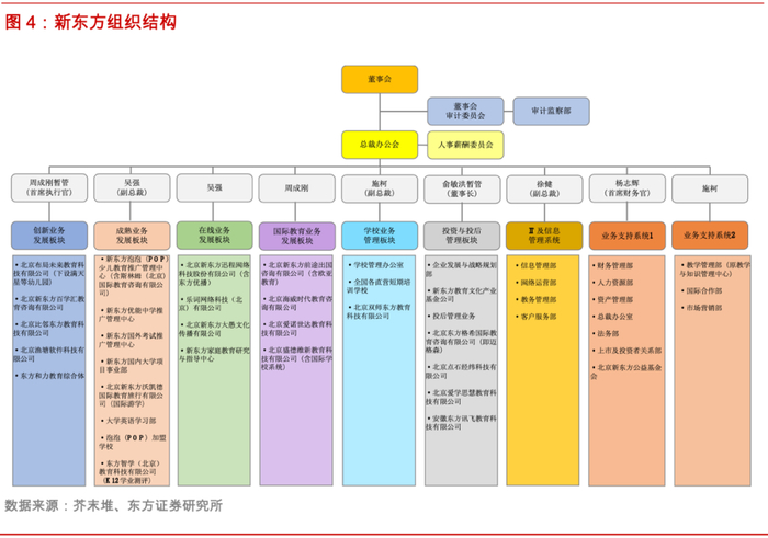 组织结构经历多次调整,九大业务板块及系统逐步成型。新东方多次对组织结构进行精细化调整。截至2018年5月24日,新东方的组织架构由以业务为核心的九大独立单元构成,副总裁吴强负责业绩增长最快的K-12业务和在线业务,董事长俞敏洪则亲自管理投资与投后管理板块。近日,新东方成立新部门——大学事业部,为集团一级结构,将整合所有成人培训业务,旨在“重塑影响力”。