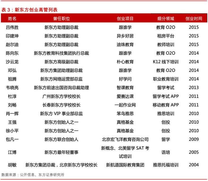 高管整体能力突出,人才辈出。新东方保持着“老师——校长——北京高管”的晋升路径,在2011年开启英才计划从内部选拔分校校长,并通过举办校长交流会,派当过校长的副总裁分区域指导分校校长。此外新东方给予分校校长较大的支配权,各分校之间实行锦标赛激励,分校之间的竞争充分锻炼了校长的管理才能,这在新东方发展早期有利于快速扩张。分校管理体系培养了一批洞悉教育行业、执行力卓越、创造收入能力极强的管理者, 在一定程度上这也是新东方创业人才众多的原因。