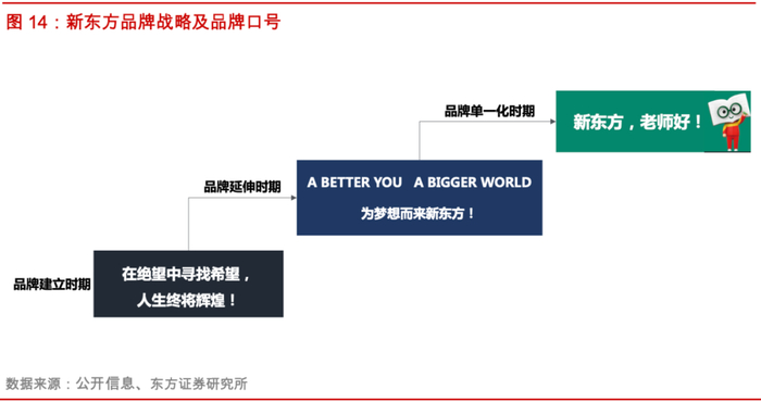 顺势调整品牌战略,助力快速发展。新东方的品牌战略可分为三个阶段:早期定位英语培训,通过“饥饿营销+顶级产品”方式打开市场并建立品牌;之后品牌延伸至整个培训行业,成功实现产业内多元化战略;由于核心业务的转变,新东方在2019年5月将核心业务子品牌合并到新东方母品牌下,以新东方中小学全科教育代替优能与泡泡,实施品牌单一化战略,降低客户沟通成本并助力业务开拓到三四线市场。