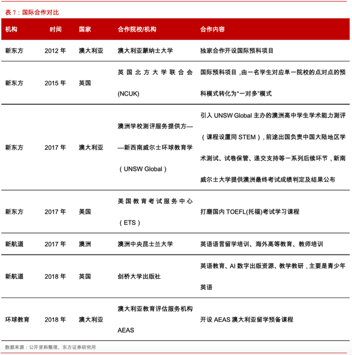国际合作涵盖多个国家,合作范围广,合作院校实力强。新东方目前已与英国、美国和澳洲高等院校或考试服务机构达成合作,合作范围广泛。在预科课程方面:2012年新东方与澳大利亚蒙纳士大学合作开设国际预科项目。2015年新东方与英国北方大学联合会(NCUK)签署战略合作协议,就NCUK英国国际预科项目开展深度合作。英国北方大学联合会由伯明翰大学等17所世界一流高校共同组成,覆盖了全英高校所有的专业设置,其中超过 77 个专业排名第一。在留学考试方面:2017年与澳洲学校测评服务提供方新西南威尔士大学环球教育学(UNSW Global)合作,引入其主办的澳洲高中学生学术能力测评考试(与STEM课程保持一致)。2017年与美国教育考试服务中心(ETS)合作打磨TOEFL(托福)考试学习课程。与留学领域其他竞品相比,新东方国际合作范围广且与多家国际知名院校开展预科课程合作及考试培训合作。