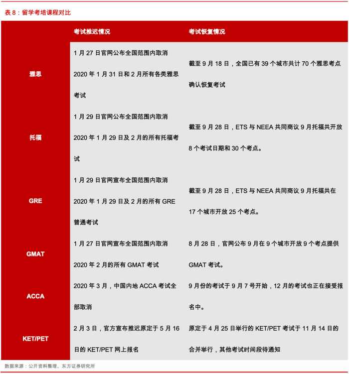 留学考试最先受到影响,咨询服务需求较为持续。受到国内公共卫生事件的影响,留学出国相关考试都相应延迟,雅思、托福等各类考试大部分从二月延迟,于7月开始恢复并陆续增加考位,而KET/PET等考试目前还未公布考试时间。从留学生的时间安排来看,准备留学的学生一般在2月开始准备语言考试,并在3-4月联系中介来准备资料及文书。而咨询服务需求相对持续,大部分学生只是推辞留学计划,咨询服务递延收入时间拉长,带来收入增速下滑。