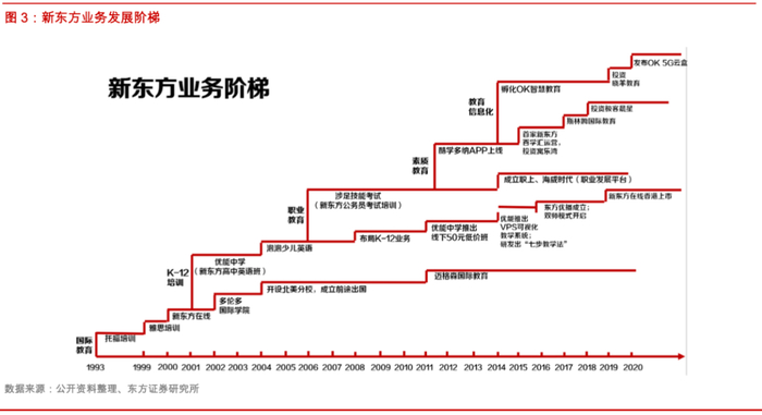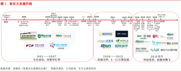 新东方教育科技集团由1993年成立的北京新东方学校发展而来,于2006年9月7日在美国纽约证券交易所成功上市,成为中国大陆首家在美国上市的教育机构。新东方的发展历程可分为三大阶段:专注语培——拓展K-12——科技变革。