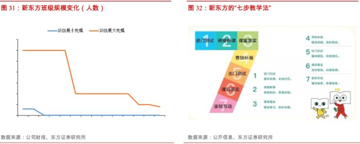 班级规模小班化以及教学流程标准化,完成产品体系搭建。2009 年新东方从大班模式转到以小班 模式为主,同时提供 1 对 1 班型。当前新东方优能班均人数在 25 左右,大班规模基本消失。截 止 FY2020Q4, 新东方的小班 VIP 课程收入占比达 25%。教学流程标准化和体系化:在课程目标上,将短期冲刺转为长线教学,使学生学习更成体系。在教学服务上,开始重视课前课后的服务,加强与家长的互动反馈。在教学标准上,新东方在 2015 年推出了业内闻名的“七步教学法”, 通过对老师和学生教学行为的管控,保证教学质量。