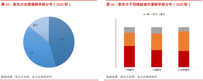 新东方课程布局以小学与初中为主,学生结构比较均衡。从全国课程分布来看,新东方K-12业务各学段占比不同,小学/初中/高中占比分别为45.7%/39.9%/14.4%,学生群体以小学和初中为主。分城市来看,随着线级越来越低,小学占比降低,初中占比提高,其中三四线城市初中占比高于小学。整体来看,K-12学生结构均衡,后续随着前期学生留存,高中占比会逐渐提升。