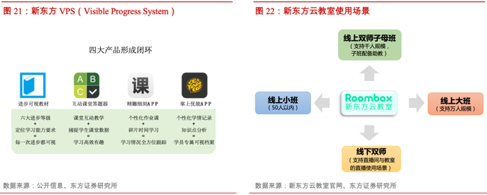 教学产品持续迭代,紧握市场竞争力。从课程内容上看,新东方已建立涵盖全学科、满足不同学员需求的内容体系。从授课形式上看,在原有面授基础上,新东方于2016年推出了线下双师模式,在公共卫生事件推动下于2020年年初开始大规模使用自有直播系统,打开单店物理空间束缚。从技术支持上看,新东方在2014年分别推出优能VPS可视化教学体系与泡泡“双优”培养英语课程,融合线上线下教学,辅助学生个性化学习,辅助老师标准化及精准化教学。