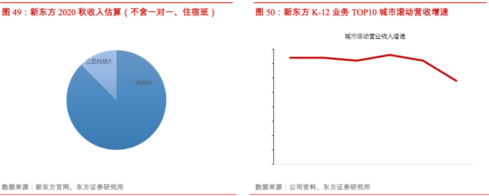 一二线城市为K-12业务主要收入来源,TOP10城市增长依然强劲。通过估算2020秋季课程收入,剔除一对一和住宿班业务后,新东方一二线城市K-12收入占比约为88%,可以看出一二线城市是主要收入来源。此外,K-12业务TOP10城市2020财年的收入占比为58%,四个季度滚动收入增速分别为36%/38%/36%/29%,新东方深耕这些城市多年,增长表现依然亮眼。