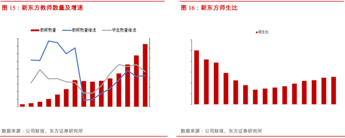 全方位管理教师,支撑公司长远发展。从2004年成立教学管理部,到2006年创设教师发展研究院,再到2019年9月8日统一升级品牌口号“新东方,老师好!”,教师的管理与培养一直是新东方的重心。在教师招聘与培训方面,各分校重点引进985/211高校毕业生、研究生及海外留学生,并根据教师职级分级培训。在绩效考核方面,新东方把课时费降下来,将激励重点放在续班奖金上。在教师可持续发展方面,为教师设置5种发展路径,满足差异化发展意愿。新东方表示未来将向全行业逐步开放教师专业发展服务。