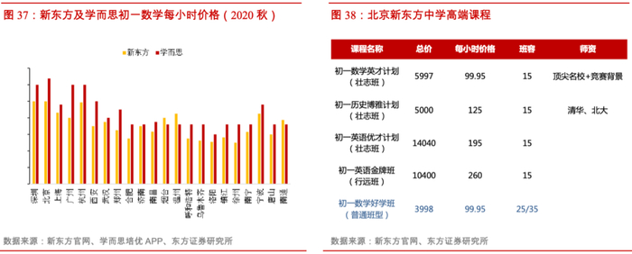 价格定位中腰部学生,推出高端产品瞄准头部市场。通过对比部分城市2020年秋季初一数学的每小时价格,我们可以发现新东方价位明显低于学而思,整体来看平均是学而思的85%左右,更多定位中腰部人群(甚至在合肥、乌鲁木齐的好学班价格仅为45元/课时)。此外,新东方部分城市推出高端课程,针对优秀学员进行能力培养,瞄准强基计划等(2020年1月教育部推出强基计划取代自主招生),帮助学生进入名校。