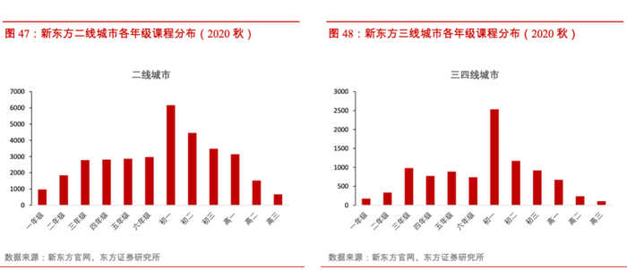 分年级看,初中各年级课程占比较高。从全国分布看,初一课程占比最高,为18.55%,其次是初二、小学三年级,占比分别为12.44%、9.73%。初中学生最为集中,接下来是小学高年级(三——六年级);年级分布还有另一个特点,即入口年级课程占比相对较高,小学三年级、初一、高一相比于同学段其他年级占比更高,说明各学段内部的生源结构呈小金字塔型。分城市来看,上述两个特点基本成立,但线级越高的城市,小学各年级占比越高。值得注意的是,三四线城市初一占比尤其高,达26.56%,即一个年级的开课量占比超过1/4,这不仅由于三线城市课外培训滞后,也在一定程度上体现出新东方中学业务优势明显。