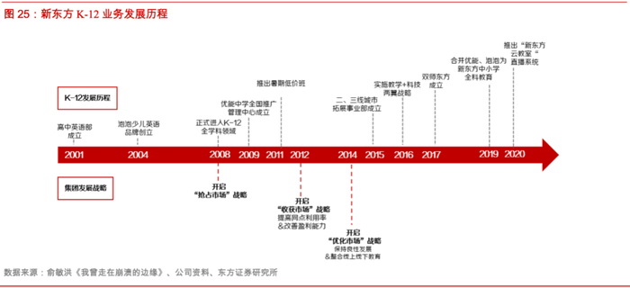 拓展K-12(2008——2015):新东方在2007年底决定从英语走向全科,进入K-12领域。集团于2008年开始启动优能、泡泡全科项目,并逐渐由最初的大班教学转向小班教学模式。在2011财年,K-12业务的营收占比为34.6%,首次超过留学考试业务成为新东方最大的收入来源。截至2020财年,K-12业务的营收占比为69%。
