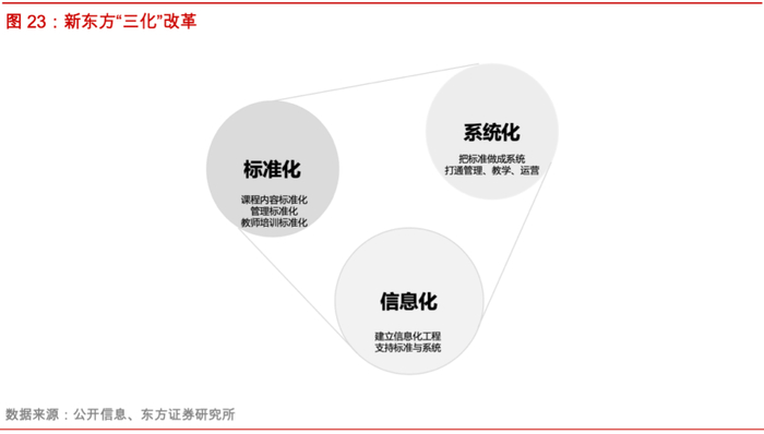 借助“三化”改革升级管理体系,实现管理转型。新东方发展初期为了鼓励快速扩张,给予分校校长很大的权力,即“人治”,但这导致了各分校治理分散。在2010年,陈向东被任命为执行总裁,主要任务是主导新东方完成由“诸侯制文化”向“集团公司“的转型,即“三化”(标准化、系统化、信息化)建设。在2019年年初发生的“年会事件”则驱动新东方强烈推进“三化”改革。“三化”的前提是标准化,然后依靠系统把标准整合,信息化则保证系统和标准的有效传播。