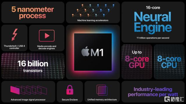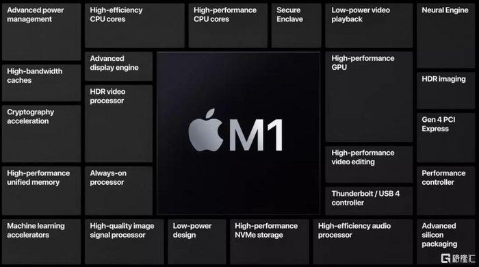 作为一款低能耗芯片,M1 拥有迄今最快的中央处理器核心、最快的个人电脑集成显卡,还有着机器学习超强的 Apple 神经网络引擎。