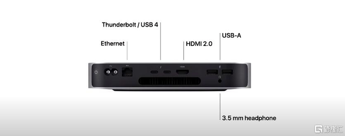 新款 Mac mini 最多可以支持两台外部显示器,以及6K显示器,显示端口选项包括 Thunderbolt / USB 4,不过新款 Mac mini 明显比上一代基于英特尔的机型少了两个Thunderbolt接口。