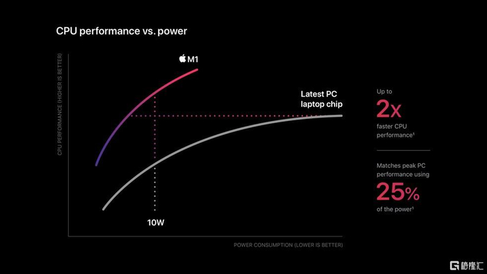 苹果表示,它提供了世界上最好的CPU每瓦特的性能。它能以四分之一的功耗提供与典型笔记本电脑CPU相同的峰值性能。