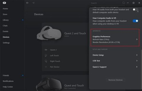 要查看所有选项,请将Quest 2连接到PC,然后转到Oculus PC软件。进入左侧的“设备”菜单,然后选择“任务2和触摸”。在右侧弹出的面板中,向下滚动找到“图形首选项”,您可以在其中更改Oculus Link的刷新率和渲染分辨率(原始Quest用户无法更改帧速率,但可以调整渲染分辨率)。