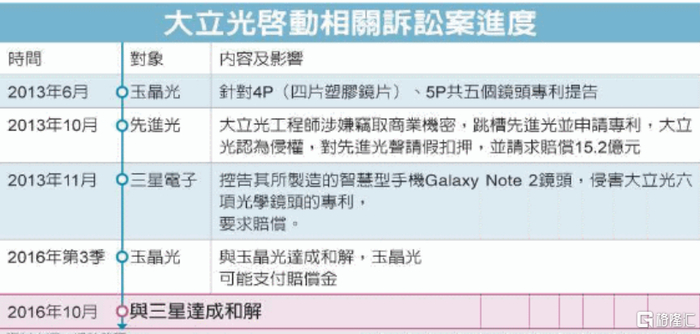 2013年10月起诉先进光,同年11月起诉三星电子。从玉晶光、先进光到三星电子,大立光启动专利大战,意在沛公。