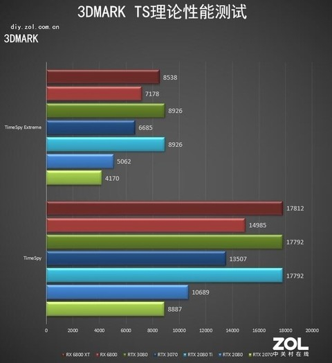 而在针对DX12环境下的Time Spy和Time Spy Extreme测试中,RX 6000系显卡没有什么优势,TS分数与RTX 3080和RTX 2080 Ti基本持平,但是在4K分辨率下出现了小幅落后。而RX 6800的差距则比较明显,对位RTX 3080的话相差很多,但是比RTX 3070要高不少。