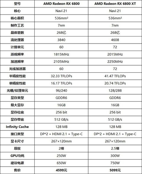 另外功耗方面,RX 6800为250W,RX 6800 XT为300W,两者的建议电源分别为650W/750W。