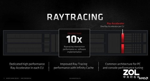 另外在每个CU中,RDNA2架构也是AMD首次加入光线追踪技术DirectX Raytracing(DXR)其中负责光线追踪的单元为Ray Accelerators(光线加速器)。