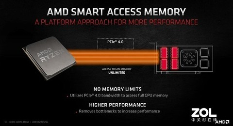 这项技术其实是一种CPU直通显存的原理,传统CPU在处理数据时一次只能读取256MB显存,而SAM技术可以消除这种瓶颈,PCIe的带宽被完全利用,扩大数据通道,一次可读取全部显存,下面我们也会进行测试对比。