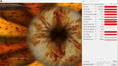 在温度测试方面,两款显卡均通过FurMark拷机软件进行拷机测试,其中RX 6800为70℃处于比较正常的范围,但是RX 6800 XT为82℃,温度有些过高,另外显卡风扇的转速始终维持在30-40%左右,比RX 6800的70℃转速还要低。