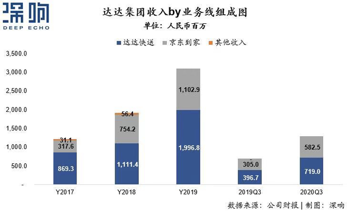 达达快送平台营收同比增长81.3%至7.19亿元人民币, 2019年同期营收为3.97亿元人民币。