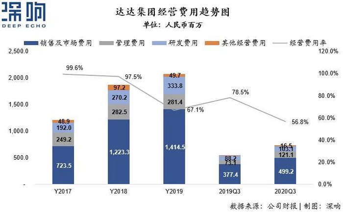 达达亏损的大幅收窄,一方面得益于毛利水平的持续改善,同时其在经营费用方面也在努力降本增效。本季度,公司总的经营费用为7.4亿元人民币,同比增长34.3%,远低于公司收入增速;公司经营费用率为56.8%,同样低于去年同期。