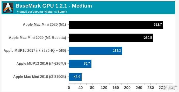 Mac Mini 2020 的 GPU 性能远超搭载英特尔芯片的 Mac Mini,并且运行速度比搭载 Radeon Pro 560 的 2017 款 MacBook Pro 快了至少 50%,而M1的功耗也降到了一个全新的水平。