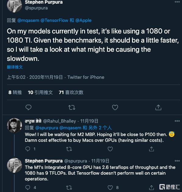 谷歌张量处理单元(TPU)技术项目经理坎瓦尔也说,苹果新推出的 M1芯片,对 mac 版本的 TensorFlow 支持很好。
