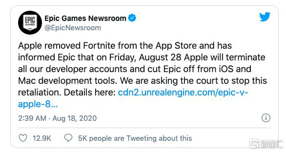 8月份,苹果将Epic Games的游戏 Fortnite (堡垒之夜)踢出 了App Store 。