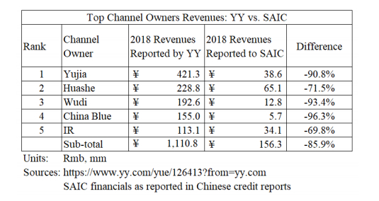 然而,我们获得了这些工会的中国信贷报告,显示他们2018年的总收入仅为1.56亿元。与YY的声明相比,存在85.9%的缺口。我们相信,根据对中国法律纠纷的审查,主播是由工会支付的,以及我们对主要工会所有者的访谈,我们相信信用报告收入数字是对主播的支付总额。下面,我们将YY的SAIC收入与YY声称的收入进行比较: