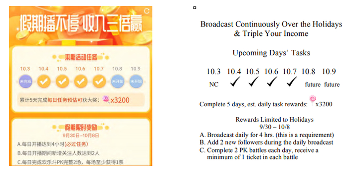 在2020年10月国庆长假期间,YY推出了名为“平台天使”的新促销活动。新的主播将获得由YY控制的付费用户(即“天使”)所送的礼物,作为按常规播出的奖励。
