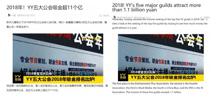 根据YY的数据,2018年按收入计算, Yujia, Huashe, Wudi, Chinablue, 和 IR是前五大工会。YY声称他们在2018年的收入超过11亿元。以下是YY网站上的一段视频截图,该视频声称“2018!YY最大的5个工会的收入超过11亿元。”