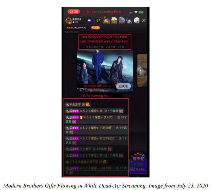 在这个样本中,我们根据虚假用户在“摩登兄弟”停播的日子里定期和反复地向他们送礼的模式来确定他们。一些给摩登兄弟送礼的付费用户还显示了与YY服务器相连的IP地址,这进一步表明他们是YY控制的机器人。