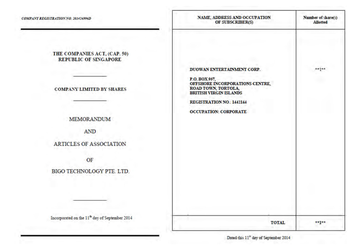 我们相信,Bigo从一开始就是为了欺诈投资者。从2015年以来,管理层一直在误导投资者,并且告诉公众,是李学凌成立了Bigo。然而,这是一个谎言:新加坡文件显示,Bigo Technology Pte.Ltd.于2014年9月11日注册成立,股东只有YY的BVI实体Duowan Entertainment Corp。