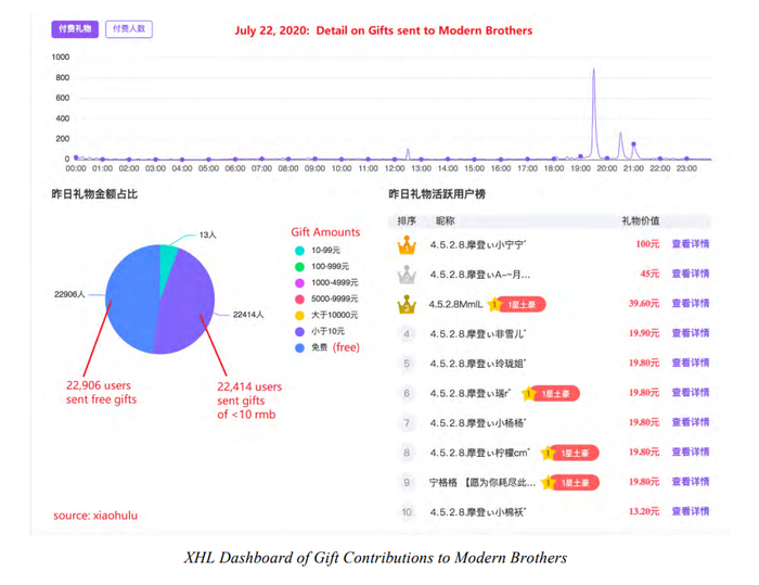 虽然摩登兄弟的正常直播时间是晚上7点到10点,但下面XHL礼品交易记录中显示的紫色线表明,虚假用户却在每天24小时不间断地发送小礼物,说明了机器人的活动时间。下面XHL仪表板上的图像显示了2020年7月22日的数据,这一天摩登兄弟没有进行直播。
