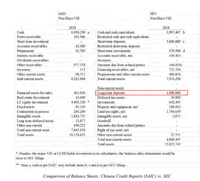 例如,YY 在2018年在美国证券交易委员会(SEC)提交的文件显示,长期存款为10亿元,如下表所示。我们认为,这一总额很可能是虚构的,或是经过大幅膨胀,因为主要的YY的在岸实体并不包含这些长期存款。对这两套财务报表进行粗略比较就可以看出这种差异。