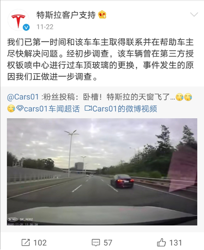 还有网友指出,这起事件可能“并不是第三方的锅”,因为国外就曾发生特斯拉汽车全景天窗整体脱落的先例。