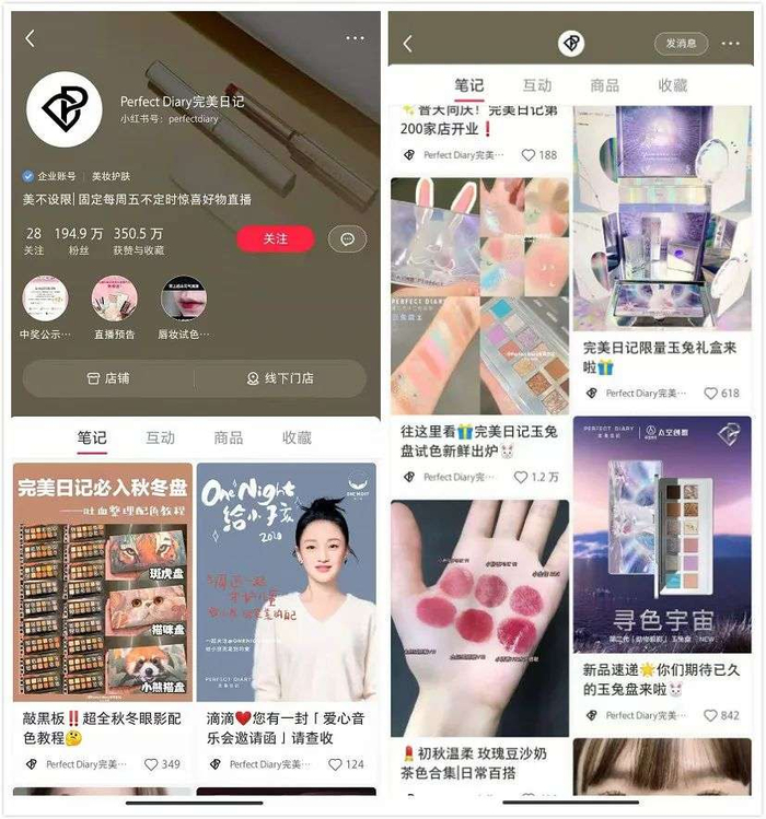 2018年,完美日记开始在小红书、抖音等内容平台走红。依靠大量生产优质内容KOL的分享和推荐,完美日记在小红书迅速树立了自己的品牌形象:高性价比、漂亮设计、强推广力及快速上新,收获了大量粉丝。这种效应外溢到电商平台后,带动了完美日记销售额的增长。