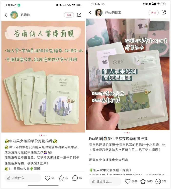 国货护肤品牌谷雨在2018年中组建了小红书运营组,随后一年多时间里,谷雨在小红书打造出多款明星产品,在扩大用户对品牌和产品认知的同时,谷雨也不断地从用户分享的笔记中提取意见,有针对性的改善产品。当发现用户对牛油果元素感兴趣后,谷雨快速推出一款仙人掌牛油果面膜,不到两个月做成了爆品。